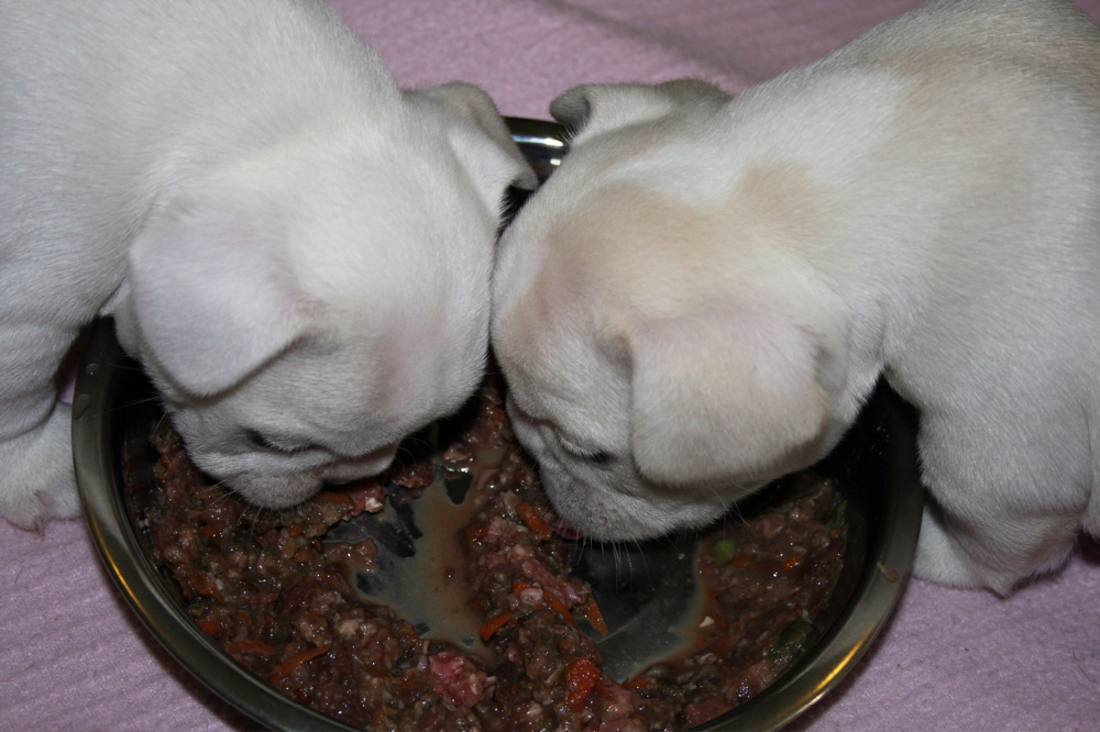 In the ‘old days’, I weaned onto rice pablum mixed with goat’s milk, eventually adding in some raw meat. The last few litters, however, I’ve gone straight to raw and the pups seem to just love it.
